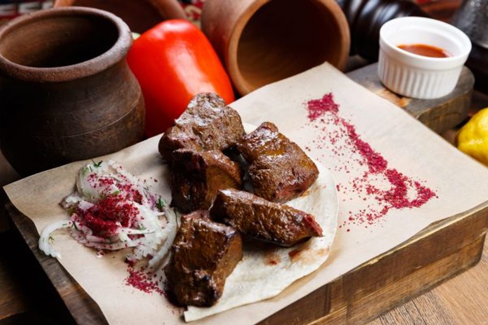 Говяжья печень на шампуре. Нежная текстура, насыщенный вкус — готовится быстро, подаётся горячей.