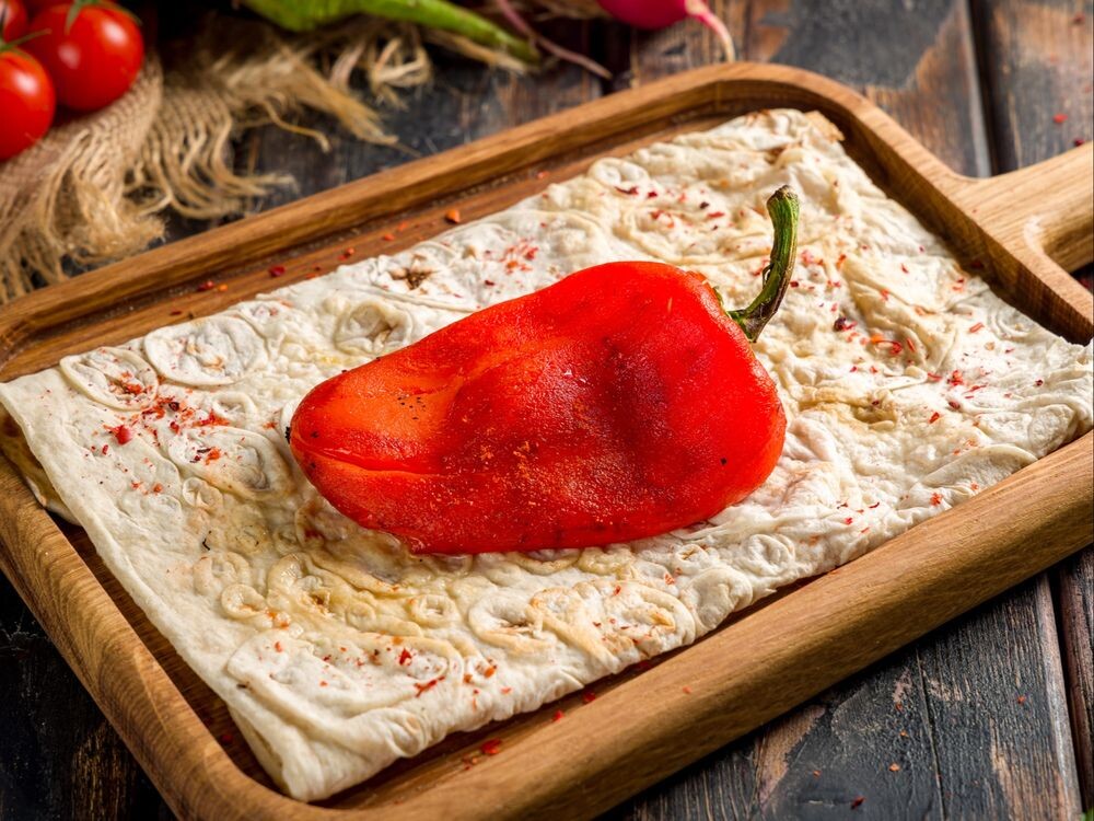 Целый болгарский перец на углях. Мягкий, сладковатый, с лёгким дымным привкусом.