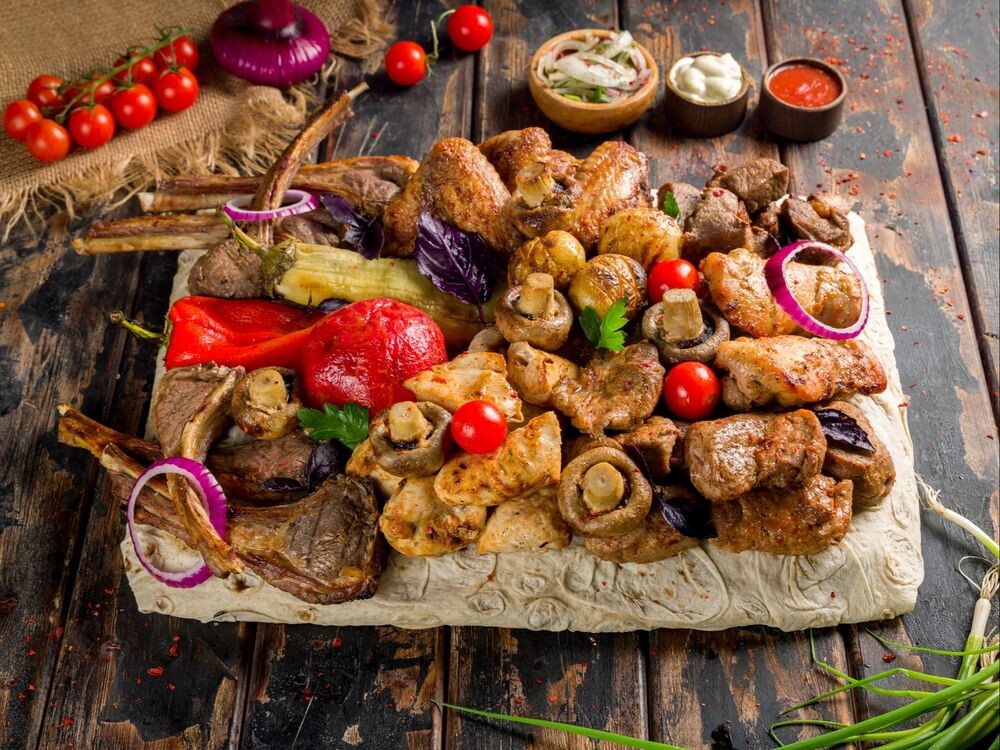 Корейка баранья, мякоть баранины, курица, свинина, овощи, соусы, лаваш.