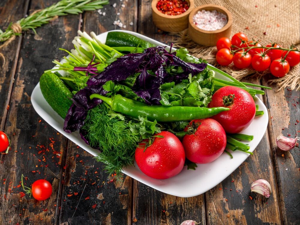 Свежие сезонные овощи, нарезанные и поданные на тарелке. Помидоры, огурцы, перец, редис, зелень.